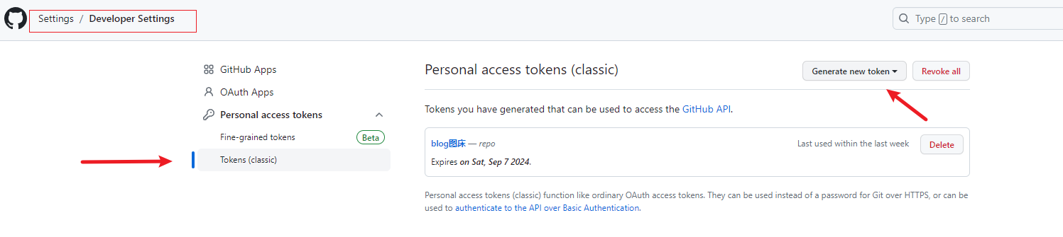 在Settings > Developer settings >Personal access tokens>Tokens中创建一个访问token。用途随意,过期时间看着办,第一个控制仓库的权限给它选上,其他默认皆可。注意这里创建完毕后要立马复制token。