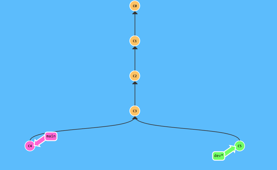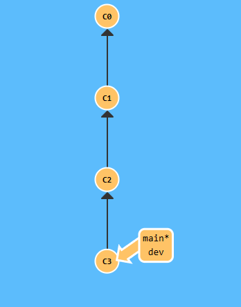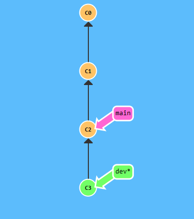 这里,我用Learn Git Branching来演示一下,这里我把上面的分支1,2,3简化成两个分支。第一个分支main,假设上面有很多文件,我在提交2也就是c2的时候删了部分文件,之后创建并切换到dev分支,然后假设我们进行开发并提交一次到c3。