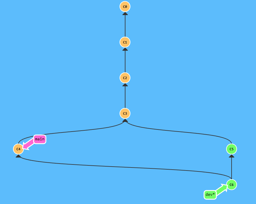 我们把main分支合并到dev分支上:git merge main,我们会发现自动出现一个c6分支,且这个分支同时指向c4分支和c5分支,这就是代表合并成功了。合并过程中没有冲突产生,Git会尝试自动完成合并操作,并且在合并完成后会生成一个新的提交。