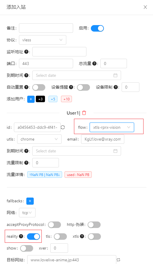 开启reality,添加用户中,flow选择xtls-rprx-vision,最后点添加即可
