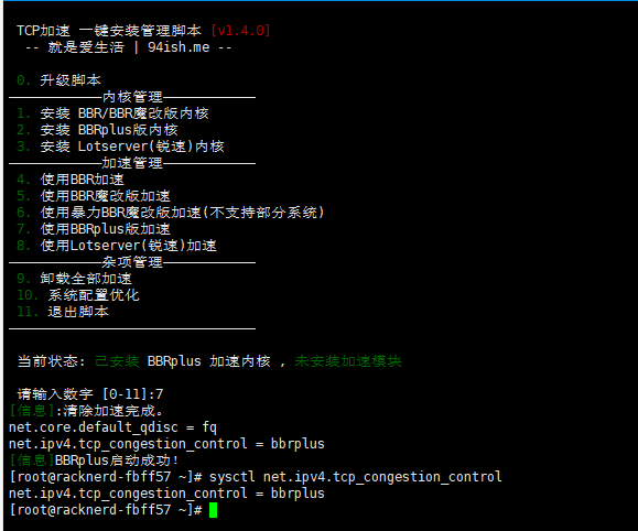 脚本自动安装的锐速内核,我们选择2,安装BBRplus内核,然后会提示我们重启VPS,我们输入y进行重启。然后在一次运行上面的脚本,状态就变成了已安装BBRplus内核但是未启动,我们只需输入7即可完成BBRplus加速。