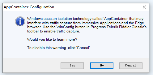 上面这个说的是,windows用了一个AppContainer的技术,可能干扰部分应用和Edg浏览器的流量捕获,你可以使用左上角的WinConfig解除这个限制,问你需要了解更多不,选cancel的话就不会在出现这个弹框。