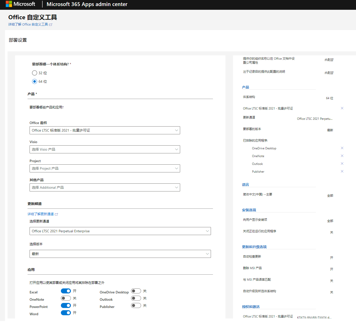 2.配置config文件 https://config.office.com/deploymentsettings ,版本推荐2021标准版,然后根据需要选择软件,并导出 xml